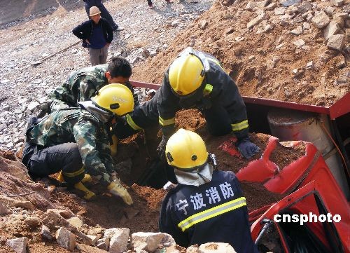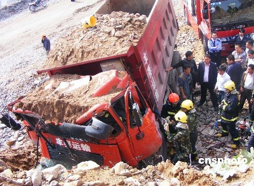 10月27日9時(shí),浙江省寧波慈城鎮(zhèn)黃山村上演驚人一幕:一輛滿載石塊車牌為皖N60589的大卡車因?yàn)橹苿?dòng)失靈,在近50度的山路陡坡上演飄移,撞向山路上的懸崖峭壁,導(dǎo)致山體局部塌方,整個(gè)車身被滾落的山石掩埋。消防部門接警后第一時(shí)間趕往現(xiàn)場,成功將被困司機(jī)救出。中新社發(fā) 何蔣勇 攝