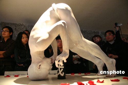 11月2日下午,馬來(lái)西亞的華裔舞者李瑞強(qiáng)在北京鼓樓東大街的一家酒吧為大家表演現(xiàn)代舞“人與神”。李瑞強(qiáng)在半露天的環(huán)境中表演個(gè)人獨(dú)舞,雖然天氣寒冷,但是他全情投入,演出忘我,使肢體動(dòng)作沖破語(yǔ)言與文化的障礙,觸動(dòng)了觀眾的心。李瑞強(qiáng)以為,舞蹈是一種活生生的生命體驗(yàn),是live art。這個(gè)舞蹈是為了引發(fā)觀眾對(duì)“人+神”主題的聯(lián)想。中新社發(fā) 郭海鵬 攝