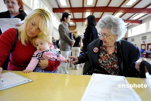 當?shù)貢r間十一月四日,美國總統(tǒng)選舉投票日,民眾參與熱情高,一百零一歲的高壽老嫗瑪?shù)吕蚰取ぢ鹇逶谕镀焙,和鄰座半歲的幼童溫特嬉戲。中新社發(fā) 陳鋼 攝