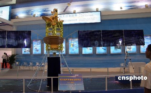 圖為中國航天科技集團公司研制的新一代通信衛(wèi)星研制平臺“東方紅四號”模型在航展上展出。中新社發(fā) 孫自法 攝