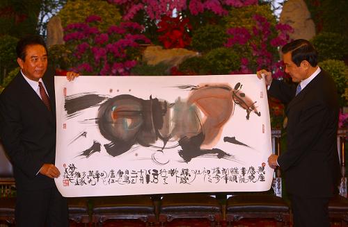 陳云林向馬英九贈(zèng)送禮品。新華社記者 邢廣利 攝