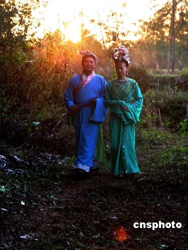 安徽黃山市一旅游景點上向游人表演黃梅戲《天仙配》,展示當?shù)匚幕。中新社發(fā) 宋吉河