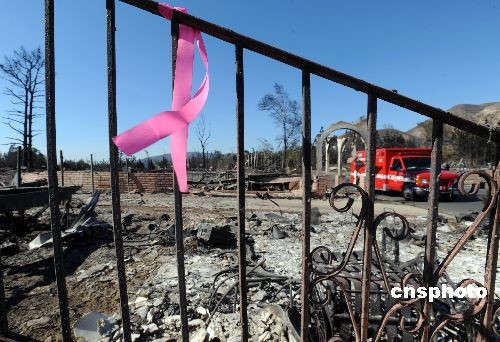 十一月十八日,洛杉磯北部希爾瑪市的一個(gè)居民區(qū)在大火中幾乎被焚毀,整個(gè)社區(qū)六百零八間住宅中的四百八十間蕩然無存。中新社發(fā) 張煒 攝