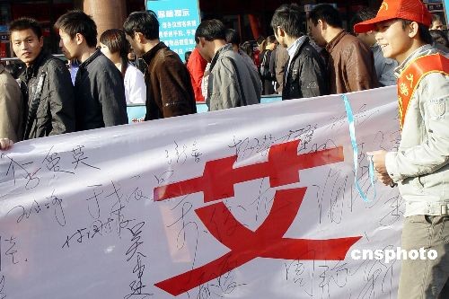 鄭州火車站過(guò)往旅客走過(guò)防“艾”簽名條幅。中新社發(fā) 李志全 攝