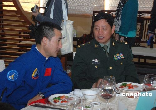 圖為駐澳門(mén)部隊(duì)司令員王玉仁在歡迎午宴上與航天英雄翟志剛交談。中新社發(fā) 畢永光 攝