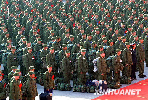 12月10日,新兵們?cè)跉g送儀式上列隊(duì)。當(dāng)日,江蘇省暨南京市歡送新兵入伍儀式在南京火車站廣場(chǎng)舉行,全省1240多名新兵從這里起程,奔赴軍營(yíng)。孫參 攝(圖片來源:新華網(wǎng))