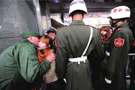 一名新兵與家人耳語道別。10日下午,北京今冬第一批450名新兵在北京西站啟程,乘坐T579次列車奔赴石家莊等地軍營(yíng)。張斌 攝(圖片來源:京華時(shí)報(bào))