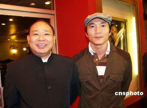 圖為左起張倫導(dǎo)演與好萊塢武打明星鄒兆龍在首映式上。中新社發(fā) 盧威 攝