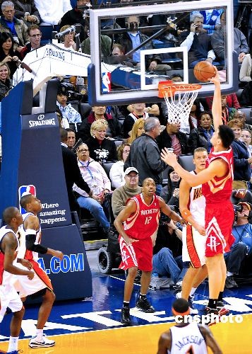 當(dāng)?shù)貢r(shí)間12月12日晚,休斯頓火箭隊(duì)與金州勇士隊(duì)在加州奧克蘭主場(chǎng)甲骨文體育館進(jìn)行一場(chǎng)比賽。姚明雖患感冒但仍拿下19分14個(gè)籃板,阿泰斯特因?yàn)橛夷_踝有傷休戰(zhàn),1號(hào)球星麥格雷迪復(fù)出首發(fā)并表現(xiàn)搶眼,最終火箭以119-108輕松戰(zhàn)勝對(duì)手取得兩連勝,時(shí)隔一周后再次大勝勇士。目前火箭總戰(zhàn)績達(dá)到15勝8負(fù),勇士7勝16負(fù)。圖為姚明上籃。中新社發(fā) 陳鋼 攝