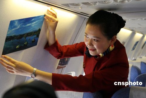 圖為飛機(jī)起飛前,乘務(wù)員精心布置機(jī)艙。中新社發(fā) 郭晉嘉 攝
