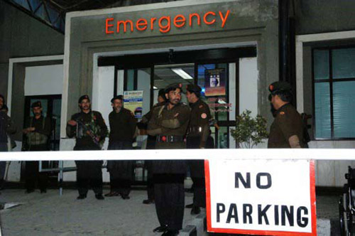 12月24日,在巴基斯坦首都伊斯蘭堡,軍警在收治受傷中國工程人員的醫(yī)院急診室外把守。李敬臣 攝