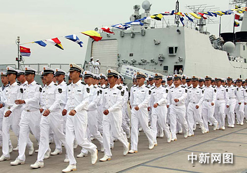 護(hù)航艦艇編隊(duì)官兵列隊(duì)從碼頭走過(guò)。