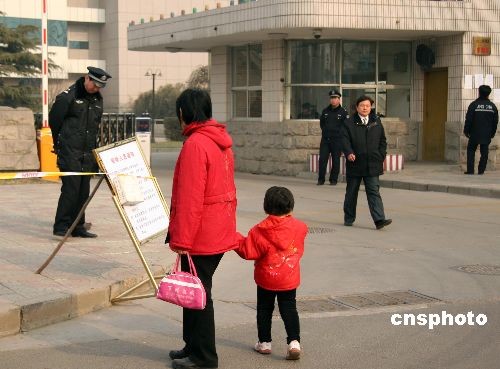圖為一對(duì)石家莊母女在法院警戒線外閱讀案件公示說(shuō)明牌。中新社發(fā) 翟羽佳 攝