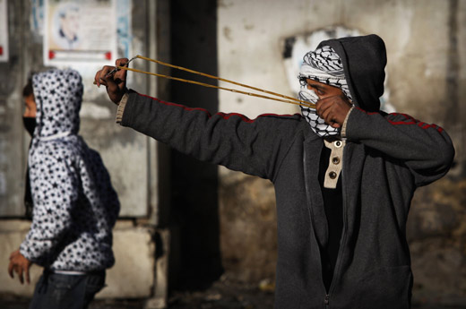 一名巴勒斯坦男孩用彈弓襲擊以色列士兵。