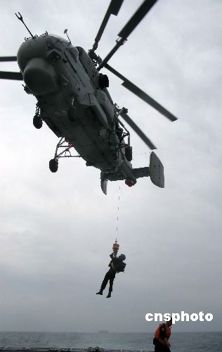 2009年元旦,中國海軍護(hù)航艦艇編隊(duì)正在印度洋航行,圖為“?凇迸灪叫型局虚_展艦機(jī)與隨艦特戰(zhàn)隊(duì)員的協(xié)同訓(xùn)練。中新社發(fā) 孫自法 攝