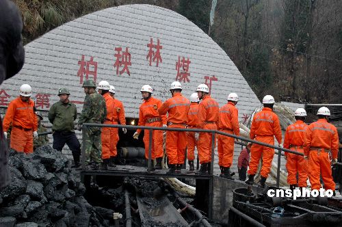 截至1月1日下午,安順透水事故搶險救援工作仍在緊張有序進(jìn)行。貴州安順市消防支隊、安順軍分區(qū)等各級救援部門的救援人員已增加到500多人,正按照救援專家的預(yù)案,在全力采取抽水等措施緊急救援。目前,抽水設(shè)備已增加到兩臺,礦井內(nèi)的積水正不斷下降。 2008年12月31日凌晨,貴州安順市西秀區(qū)蔡官鎮(zhèn)柏秧林煤礦發(fā)生一起透水事故,13名礦工被困井下。中新社發(fā) 郭勇 攝