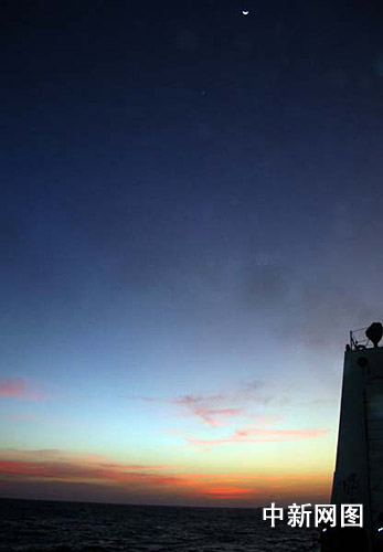 1月2日,中國海軍護(hù)航艦艇編隊(duì)繼續(xù)在印度洋航行,圖為航行途中在“?凇迸炆纤臄z的印度洋晚霞映月景觀。 中新網(wǎng)記者 孫自法 攝