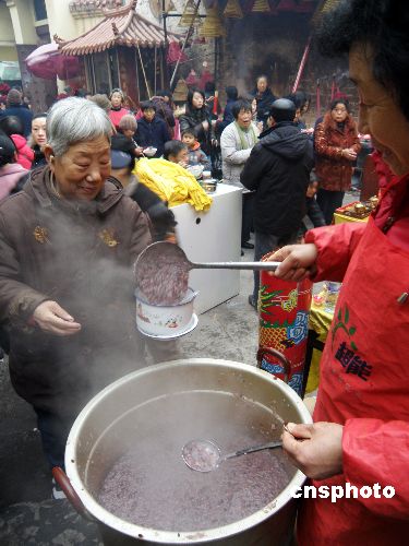 2009年1月3日,農(nóng)歷臘月初八,是中國傳統(tǒng)的臘八節(jié),湖北宜昌三峽古佛寺里準備了豐盛的臘八粥,眾多名市民在古佛寺里喜吃臘八粥。據(jù)悉,臘八粥又稱佛粥,與佛祖釋迦牟尼得道成佛有關。臘八粥在民間被視為吉祥食品,寓意一年之末的大豐收及來年風調(diào)雨順,吉祥如意。中新社發(fā) 劉君鳳 攝
