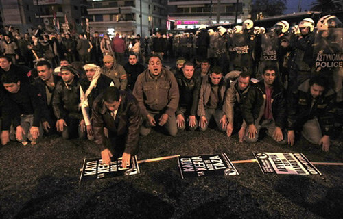 圖為希臘民眾為在空襲中死去的巴勒斯坦民眾祈禱。