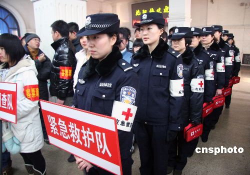 2009年1月7日,在沈陽站候車室8名身佩紅十字袖標(biāo)英姿颯爽的沈鐵公安紅十字應(yīng)急救護隊的女警正式上崗,這是全國鐵路公安機關(guān)第一支專業(yè)應(yīng)急救護隊伍。中新社發(fā) 趙敬東 攝