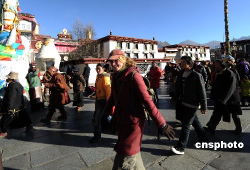 圖:外國(guó)游客愉悅游覽拉薩大昭寺廣場(chǎng)