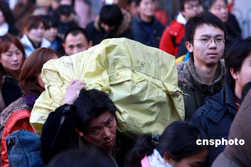 1月11日,為期40天的中國2009年春運正式開始,春運客流壓力依然很大,客流的剛性需求特征十分明顯,預(yù)計全國鐵路旅客發(fā)送量將達1.88億人,比去年同期增長8%,日均470萬人,春運“一票難求”的問題仍突出。圖為北京西站的客流不斷。