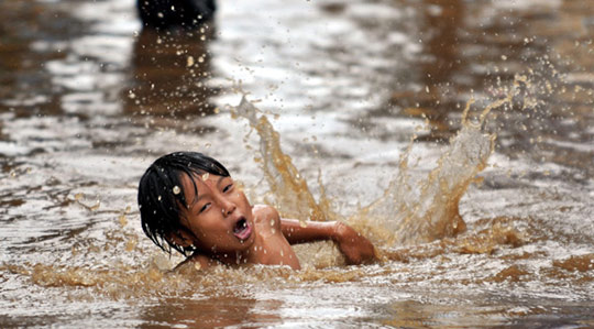 1月14日,在印度尼西亞首都雅加達(dá)市中心,一名男孩在暴雨過后被水淹沒的街道上游泳。