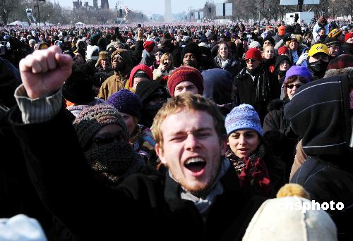 圖為在場(chǎng)民眾振臂高呼奧巴馬競(jìng)選名言“Yes! We Can”。中新社發(fā) 邱江波 攝