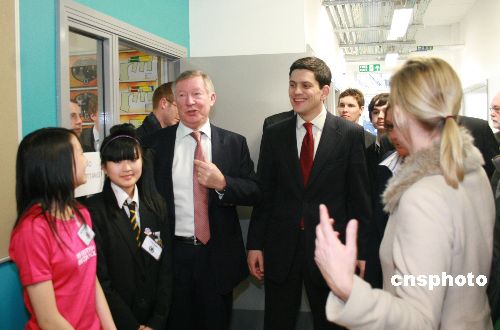 當(dāng)?shù)貢r(shí)間22日下午,英國(guó)外交大臣米利班德在曼徹斯特發(fā)布英國(guó)政府首個(gè)對(duì)華關(guān)系框架性文件后,與英超曼聯(lián)俱樂部主教練弗格森爵士一起來到斯達(dá)芒頓中學(xué),了解該校師生去年訪華的體會(huì)。圖為米利班德(左四)和弗格森(左三)與該校的華裔學(xué)生在一起。中新社發(fā) 李鵬 攝