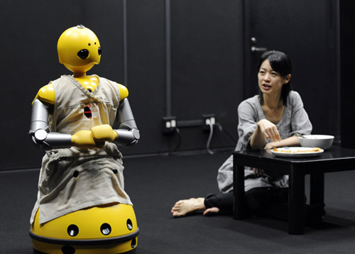 會表演話劇的機(jī)器人:在日本大阪大學(xué),一個取名為若丸的機(jī)器人與一名女演員同臺表演。這臺時長為20分鐘的演出由機(jī)器人與演員共同完成。