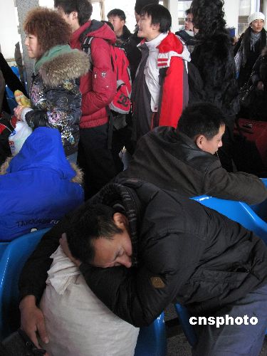 1月23日,一批批的旅客從北京站登車回鄉(xiāng)過農(nóng)歷已丑年(牛年)的春節(jié)。一名辛苦一年的壯年民工,在候車大廳等車中,提早進(jìn)入了新春的夢(mèng)鄉(xiāng)。為回鄉(xiāng)過農(nóng)歷已丑年(牛年)的春節(jié),許多在北京的旅客,早早離開臨時(shí)居所,在車站休息。當(dāng)日是中國(guó)春運(yùn)第13天,中國(guó)客流最高峰已經(jīng)到來,中國(guó)鐵路共開行臨客754列,其中直通臨客393列。中新社發(fā) 鄒憲 攝