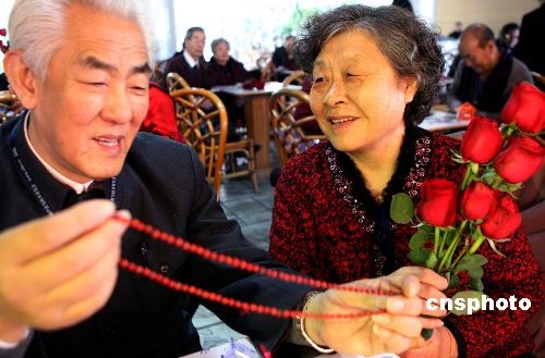2月9日,中國(guó)傳統(tǒng)元宵佳節(jié)到來之際,北京植物園上演的“浪漫玫瑰文化周”吸引99對(duì)金婚夫婦共度元宵佳節(jié),特邀而來的金婚夫婦(結(jié)婚滿50年)手捧著政府當(dāng)年頒發(fā)的不同版本的結(jié)婚證,相互獻(xiàn)上象征愛情的紅玫瑰、相思紅豆,交換金婚禮物,重溫愛的誓言,在鮮花前回憶浪漫的美好時(shí)光,許多長(zhǎng)者回憶起風(fēng)風(fēng)雨雨幾十年的時(shí)光,激動(dòng)得熱淚盈眶。中新社發(fā) 錢興強(qiáng) 攝