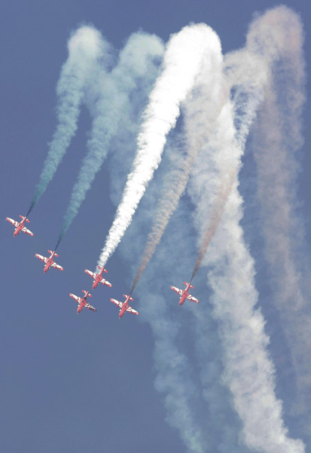 2月11日,在印度南部城市班加羅爾,印度空軍“陽光”特技飛行表演隊(duì)在航展開幕式上表演。