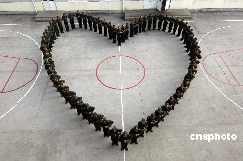 浙江溫州邊防支隊新兵連戰(zhàn)士們在籃球場上組成一個美麗的軍綠色“心”形圖案,給遠方的父母和女友送去祝福。中新社發(fā) 吳水斌 攝