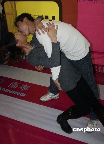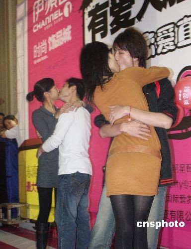 2月14日晚,廣西南寧市一家商場舉辦的接吻大賽中,六對情侶不斷變換各式接吻姿勢一決高低。最終一對“90后”最終憑借千奇百怪的接吻姿勢,在激吻近半小時(shí)后奪冠。中新社發(fā) 王剛 攝