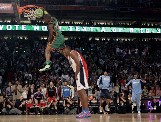 中新網(wǎng)2月15日電 北京時(shí)間2月15日,NBA全明星周末繼續(xù)進(jìn)行,其中深受全世界球迷喜愛(ài)的扣籃大賽火爆上演。身高只有1米70的“小土豆”內(nèi)特-羅賓遜在決賽中做出了飛躍上屆扣籃大賽冠軍、身披“超人”斗篷的霍華德后扣籃的動(dòng)作,這個(gè)被稱為“飛躍超人”的扣籃使羅賓遜繼2006年后第二次獲得扣籃王,成為2009年全明星周末的扣籃冠軍。