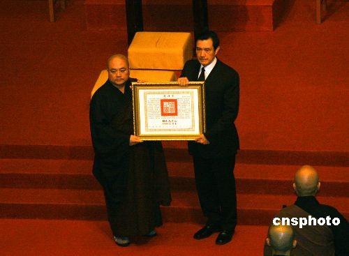 2月15日,臺(tái)灣法鼓山創(chuàng)辦人圣嚴(yán)法師追思法會(huì)暨植存在法鼓山舉行。圖為參加追思法會(huì)暨植存儀式的臺(tái)灣地區(qū)領(lǐng)導(dǎo)人馬英九頒發(fā)褒揚(yáng)令予圣嚴(yán)法師,再送圣嚴(yán)法師最后一程,由法鼓山新任方丈果東法師接受褒揚(yáng)令。中新社發(fā) 陳立宇 攝