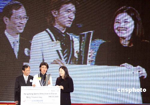 二月十六日,“2008中銀香港杰出運(yùn)動員選舉”得獎結(jié)果在香港會展中心舉行的頒獎典禮上揭曉。圖為香港特區(qū)立法會主席曾鈺成與伏明霞為香港杰出運(yùn)動員黃金寶頒獎。中新社發(fā) 張勤 攝