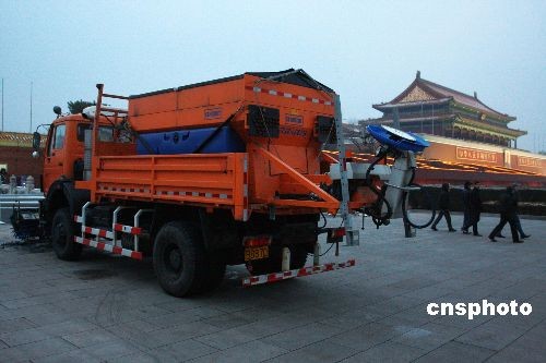 2月18日,大型掃雪車北京天安門(mén)廣場(chǎng)備戰(zhàn)連續(xù)的降雪天氣。氣象專家表示,此次降雪除自然因素外,人工影響天氣作業(yè)也起到很大作用,預(yù)計(jì)降雪將持續(xù)到19日。中新社發(fā) 鄭雄增 攝