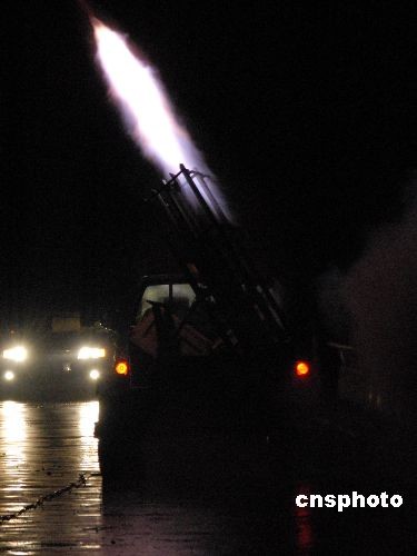 2月19日凌晨時分,山東棗莊,工作人員正在實施火箭人工增雨作業(yè)。當日,受西南暖濕氣流和弱冷空氣影響,山東棗莊出現(xiàn)降雨天氣,當?shù)貧庀蟛块T抓住有利時機,在臺兒莊、嶧城等地進行大范圍聯(lián)合作業(yè),以緩解旱情,這也是當?shù)貧庀蟛块T開展的第二次多方位集中人工增雨。到今天早上8時許,全市平均降雨量達到5毫米。中新社發(fā) 高啟民 攝