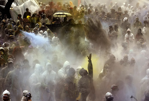 3月2日,人們在希臘雅典西北小城加拉希迪的街道上用加了各種天然顏料的面粉互相投撒,表達(dá)祝福。