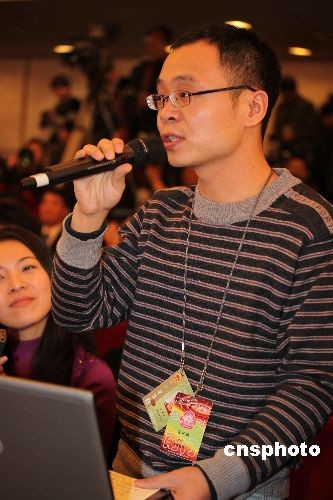 3月4日,在十一屆全國(guó)人大二次會(huì)議舉行的首場(chǎng)新聞發(fā)布會(huì)上,中新社記者孫宇挺就中法關(guān)系、圓明園獸首銅像被拍賣等問(wèn)題向大會(huì)發(fā)言人李肇星提問(wèn)。中新社發(fā) 張婭子 攝