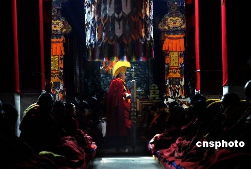 3月4日,中國藏歷新年正月初八,西藏拉薩哲蚌寺,“鐵棒喇嘛”在措欽大殿舉行的傳昭大法會上!拌F棒喇嘛”藏名:“格貴”,負(fù)責(zé)維持僧團(tuán)清規(guī)戒律的寺院執(zhí)事,歷史上藏傳佛教各大寺院的糾察僧官巡視僧紀(jì)時,常隨身攜帶鐵杖,故有“鐵棒喇嘛”之俗稱。中新社發(fā) 廖攀 攝