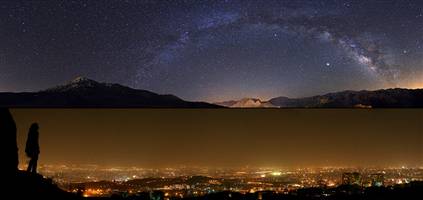 “夜空下的世界”項目的另外一重要目標,就是提醒人類注意城市燈光污染,F(xiàn)在城市明亮的燈光已讓人們很難看到夜空中的星星。本圖上半部分的弧形,其實就是伊朗北部上空的銀河,而下半部分則是燈光污染的德黑蘭。耀眼的燈光在照亮世界的同時也帶來了燈光污染,太亮的燈光可能導(dǎo)致居民無法安睡、司機駕車炫目等。對天文學(xué)家和天文愛好者來說,眾多的強亮光還嚴重影響他們觀測星空。世界多個國家已經(jīng)開始與燈光污染作斗爭,比如在一些新開發(fā)的地區(qū),要求安裝不正對空中的燈光裝置,鼓勵夜晚照明燈光全部射向地面。