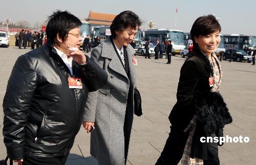3月8日,眾多女委員在國際婦女節(jié)當(dāng)日出席全國政協(xié)十一屆二次會(huì)議第三次全體會(huì)議。圖為央視女主持人李瑞英、海霞和歌星韓紅在會(huì)后輕松步出人民大會(huì)堂。中新社發(fā) 楊可佳 攝