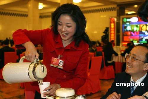 3月10日下午,十一屆全國(guó)人大二次會(huì)議在北京人民大會(huì)堂舉行第三次全體大會(huì),聽(tīng)取最高人民法院和最高人民檢察院的工作報(bào)告。會(huì)前,上海代表團(tuán)的打工妹代表朱雪芹臨時(shí)“改行”,熱情地為其他代表沏茶倒水。中新社發(fā) 任晨鳴 攝 點(diǎn)擊進(jìn)入2009兩會(huì)圖片報(bào)道專(zhuān)集