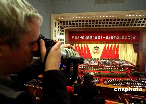 3月12日,全國政協(xié)十一屆二次會(huì)議舉行閉幕大會(huì)。圖為外國記者在會(huì)場拍照。中新社發(fā) 宋吉河 攝