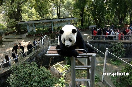 三月十二日,臺(tái)灣游客正在福州熊貓世界觀看熊貓。大熊貓“團(tuán)團(tuán)”、“圓圓”在臺(tái)灣產(chǎn)生的效應(yīng),致使現(xiàn)在來(lái)福州觀看熊貓的臺(tái)灣游客比以前增加三倍以上。中新社發(fā) 王東明 攝