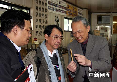 3月14日,由臺北縣政府文化局委托的專家組在“臺北縣博物館家族”之一的陳逢顯毫芒雕刻博物館內(nèi)調(diào)研。圖為臺灣著名微雕家陳逢顯(右一)向?qū)<医M成員展示微雕創(chuàng)作用的特殊工具。作者:陳立宇