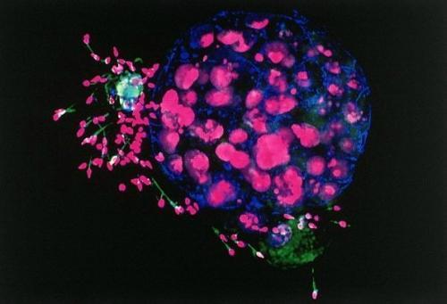 人類胚胎和精子:這張色彩艷麗的美麗圖片,是利用共聚焦顯微鏡拍攝的。胚胎和精細胞核呈紫色,而精子的尾巴是綠色。藍色區(qū)域是縫隙連接(gap junction),它們把細胞彼此聯(lián)系在一起。